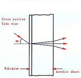 全息屏幕是將一層全息薄 膜壓在半透明的亞克力的薄板上。這全息薄膜只對從35°背投的光線(xiàn)有作用。其它光線(xiàn)如太陽(yáng)光和其它周?chē)饩(xiàn)被忽略。